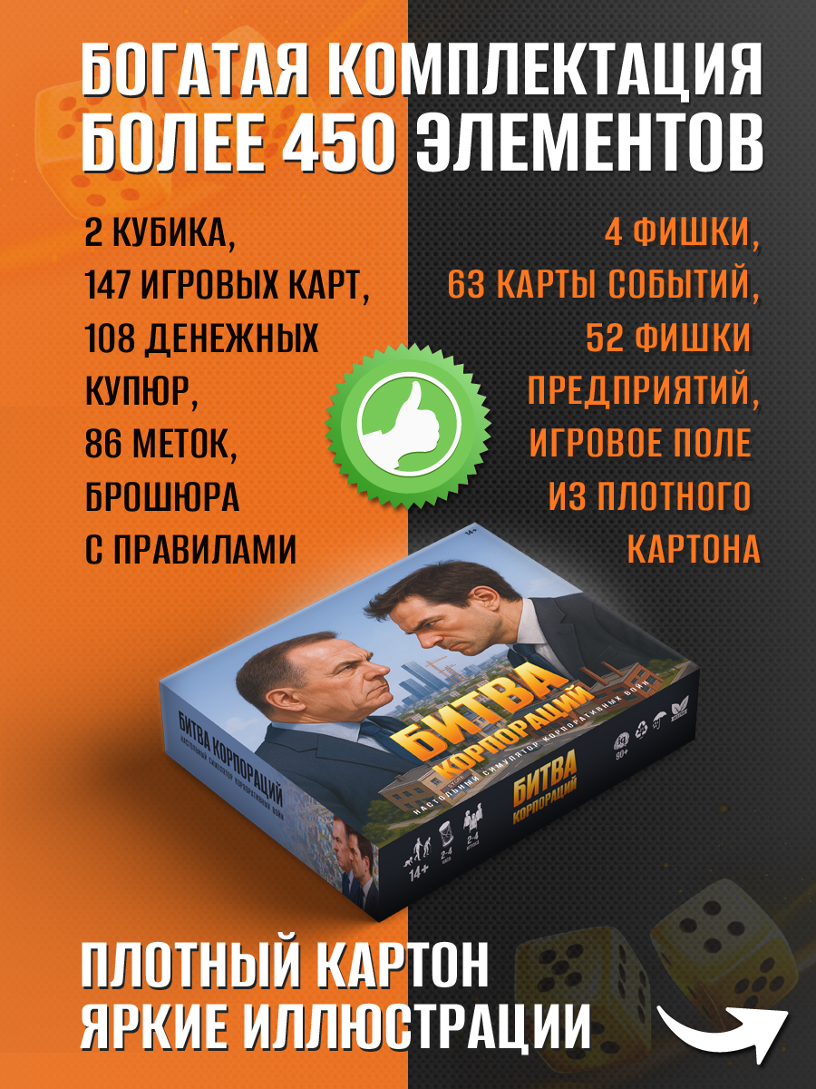 Компоненты на высоте: яркие иллюстрации, плотный картон с насыщенными цветами, компактный размер коробки и богатая комплектация делают игру не только увлекательной, но и приятной в использовании. В набор входят 2 кубика, 4 фишки игроков, 147 игровых карт Козырей, 63 карты Событий, 108 денежных купюр, 24 картонные метки состояний, 52 картонные фишки предприятий, 62 игровые картонные метки, большое игровое поле, подробная брошюра с правилами и бонус — три удобные карты-напоминалки с товарами внутриигровых магазинов. Это не просто настольная игра для 2–4 игроков, а полноценный бизнес-симулятор с высоким качеством исполнения, который станет отличным подарком любителю настольных игр, стратегий и экономических симуляторов или подарком на 23 февраля мужчине.